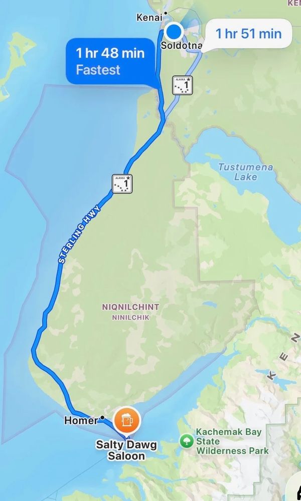 From the cabin simply take a left on K Beach Road, When you come to the Sterling highway, take a right at the T and you’re on the way to Homer. Enjoy the breath taking views as you head down the hill towards Homer and the Spit. Be sure to stop by the world famous Salty Dawg Saloon and leave your autographed dollar while enjoying all that Homer has to offer.
